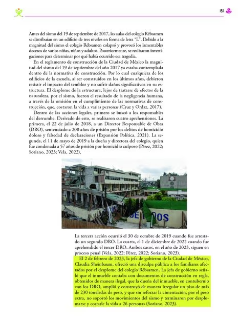 No se menciona al presidente de México, pero sí a Claudia Sheinbaum, cuando era jefa de gobierno de la Ciudad de México. Al hablar de los sismos del 19 de septiembre de 2017, el libro “Ética, Naturaleza y Sociedad” relata el derrumbe del colegio Rébsamen, y en la página 151 y 152 se refieren a la hoy aspirante a la Presidencia. Dicen, que el 2 de febrero de 2023, Sheinbaum “ofreció una disculpa pública a los familiares afectados por el desplome del colegio Rébsamen”. La citan cuando dijo que “la explicación de lo sucedido es producto de la negligencia y la corrupción de particulares y autoridades que hoy enfrentan a la justicia”.