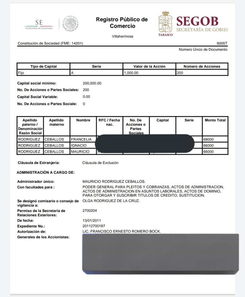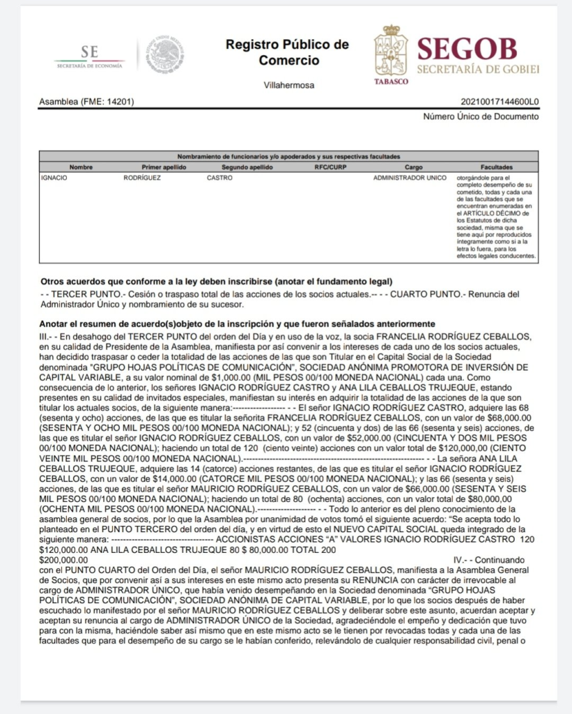 Después en el año 2021 los tres hermanos ceden sus acciones a sus padres Ignacio Rodríguez Castro y Ana Lilia Ceballos. Cabe mencionar que ambos son muy cercanos al presidente López Obrador