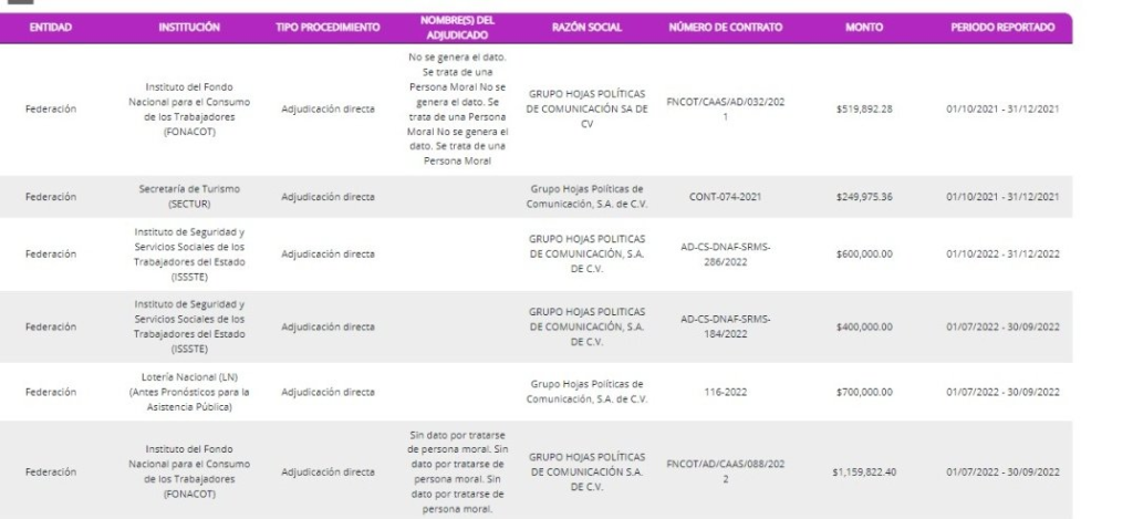 La empresa «Hojas Políticas de Comunicación» ha recibido seis contratos desde que AMLO llegó al poder, dos en el año 2021 y 4 en el año 2022. Todos en conjunto suman la cantidad de $3,629,689.00 es decir alrededor de 151 mil pesos por mes.