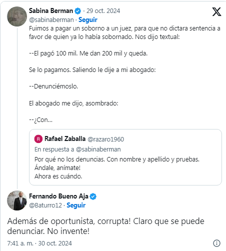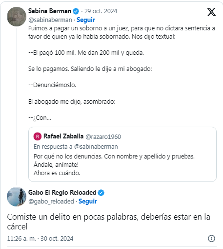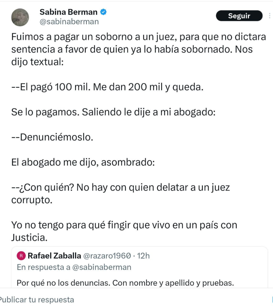 En un mensaje en el que pretendía demostrar la corrupción que existe en el sistema de justicia mexicano, la periodista Sabina Berman confesó que sobornó a un juez para obtener una sentencia a su favor.