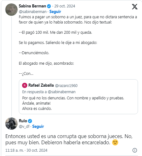 “Entonces usted es una corrupta que soborna jueces. No, pues muy bien. Debieron haberla encarcelado”.