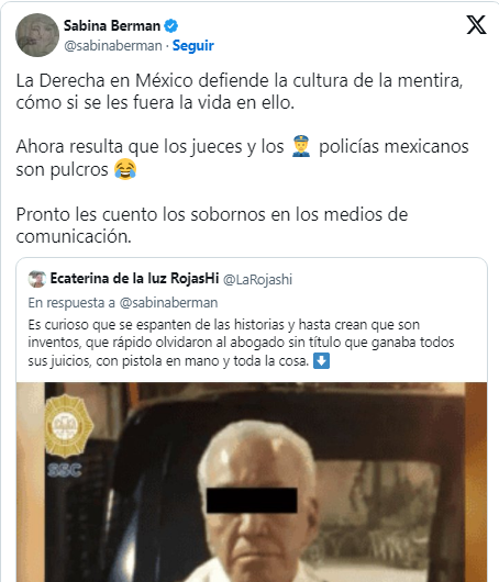 “La derecha en México defiende la cultura de la mentira, como si se les fuera la vida en ello. Ahora resulta que los jueces y los policías mexicanos son pulcros. Pronto les cuento los sobornos en los medios de comunicación”.