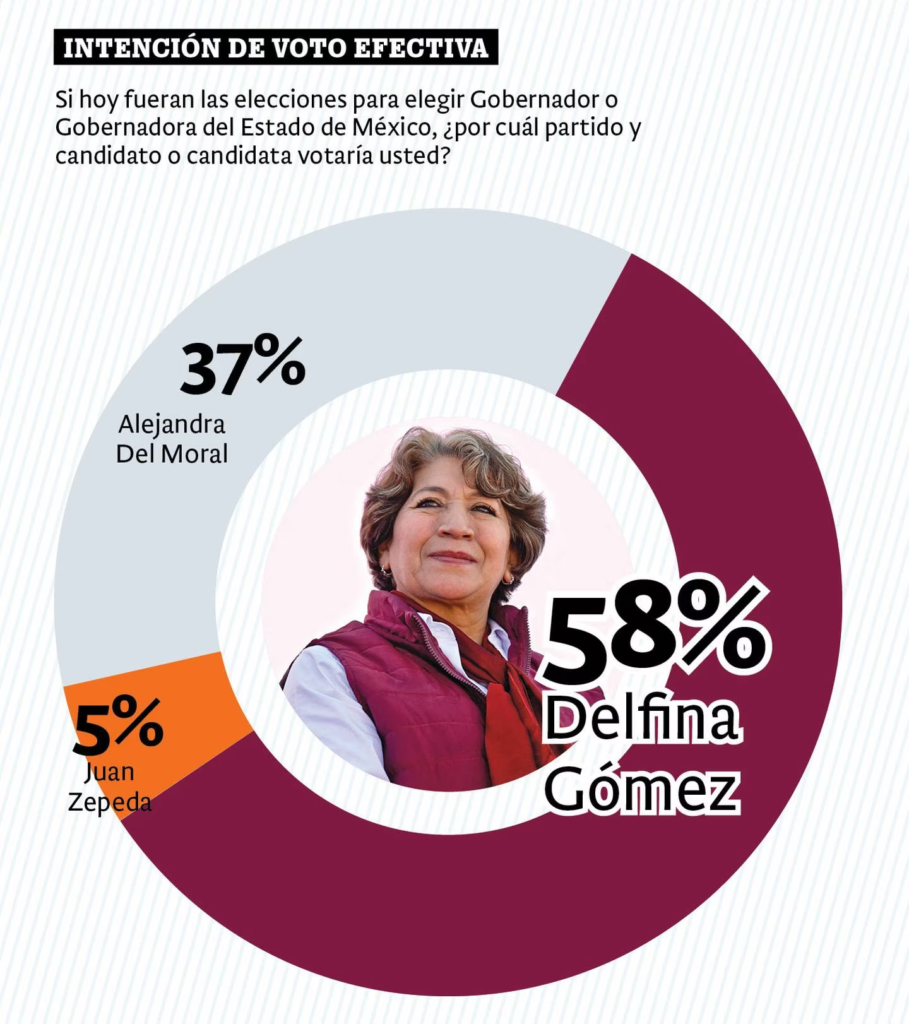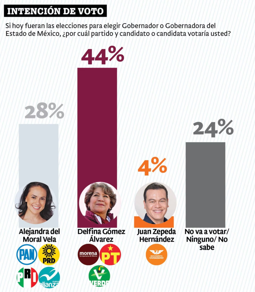 En la pregunta Si hoy fueran las elecciones para elegir gobernador o gobernadora del Estado de México, ¿por cuál partido y candidato o candidata votaría usted?, 44% dijo Delfina Gómez, precandidata por la alianza Morena, PT y PVEM.