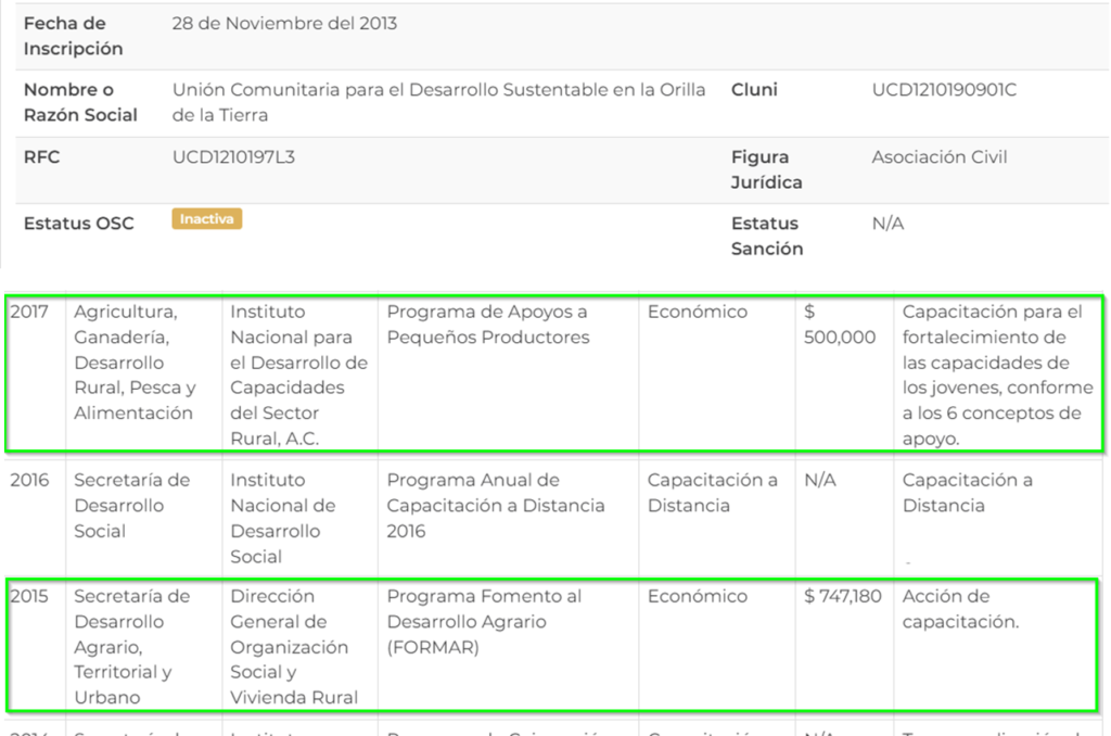 En el registro de Organizaciones de la Sociedad Civil se identifica que la asociación está Inactiva pero si se identifica un estímulo económico recibido