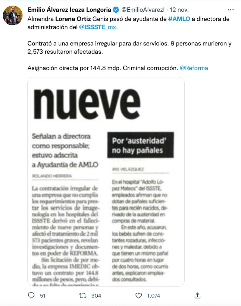 De hecho, el ISSSTE ya está bajo la lupa por esta contratación —adjudicación— directa y cuyas consecuencias se ven reflejadas en la suspensión y retraso de servicios especializados, diagnósticos y nueve muertes.