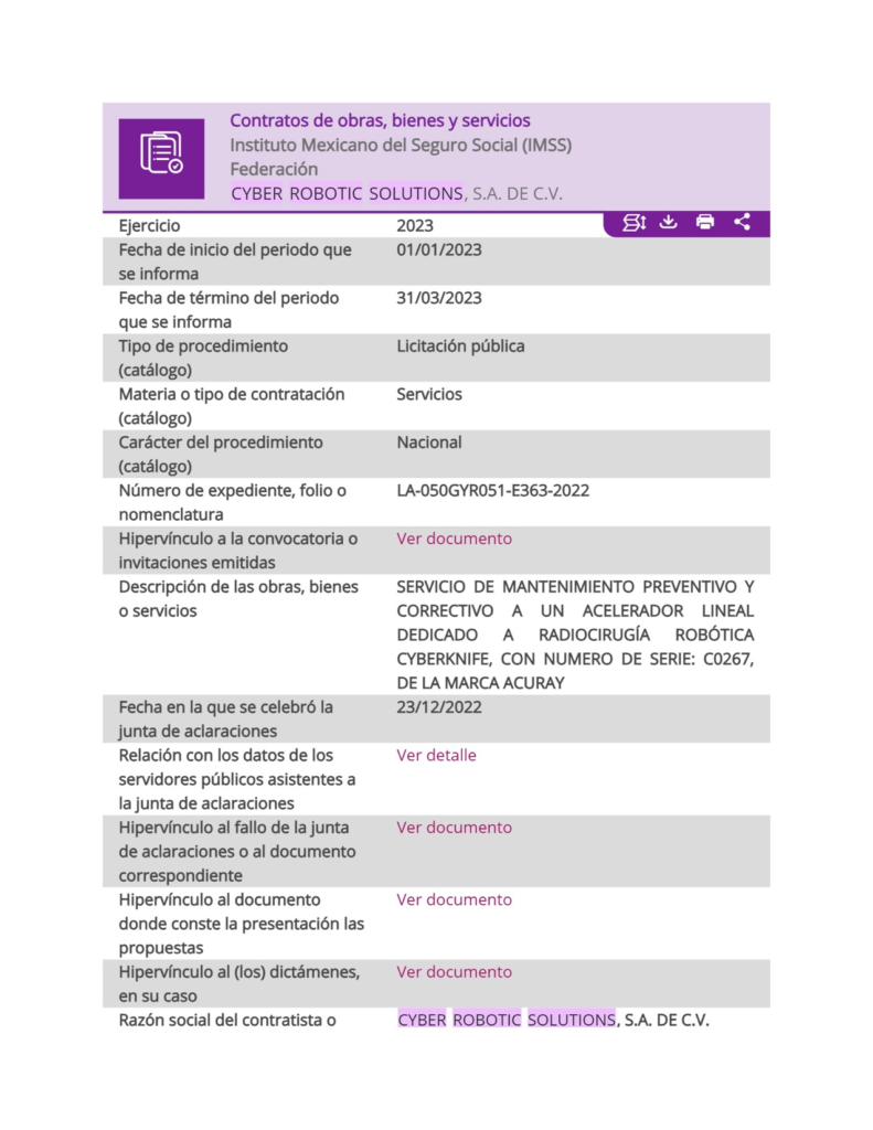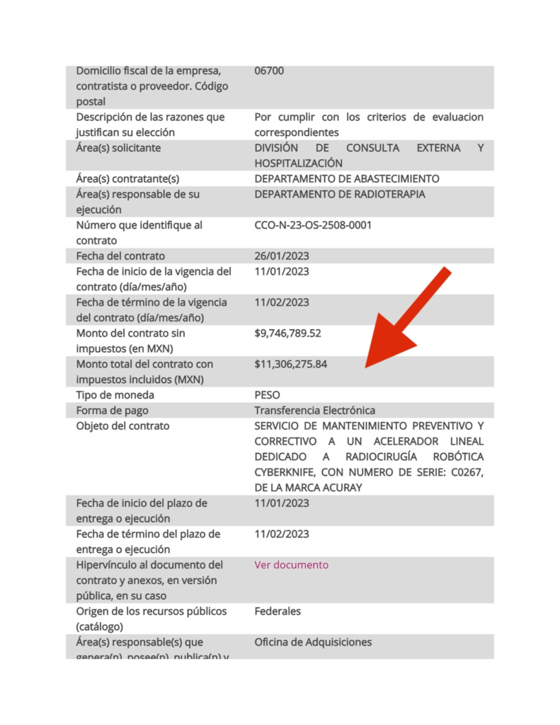 El contrato celebrado por la empresa Cyber Robotic Solutions con el Instituto Mexicano del Seguro Social fue de 11 millones 306 mil 275 pesos, para el Servicio de Mantenimiento Preventivo y Correctivo a un acelerador lineal de radiocirugía robótica CyberKnife, con número de serie C0267, de la marca Acura. Esto de acuerdo al contrato número CCO-N-23-OS-2508-0001, que fue celebrado por el IMSS y la empresa el 11 de enero de 2023.