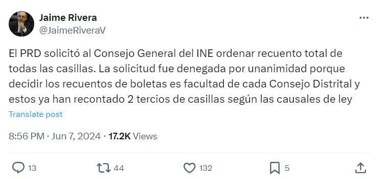 El Instituto Nacional Electoral (INE) determinó que no se hará un recuento del 100 por ciento total de las casillas electorales tras los comicios del 2 de junio, como solicitó el Partido de la Revolución Democrática (PRD).