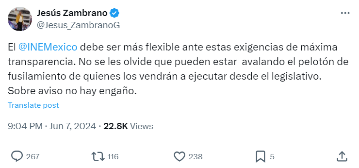 En tanto, este viernes tras la decisión del INE, Zambrano llamó al instituto a ser más flexible ante la petición de máxima transparencia.