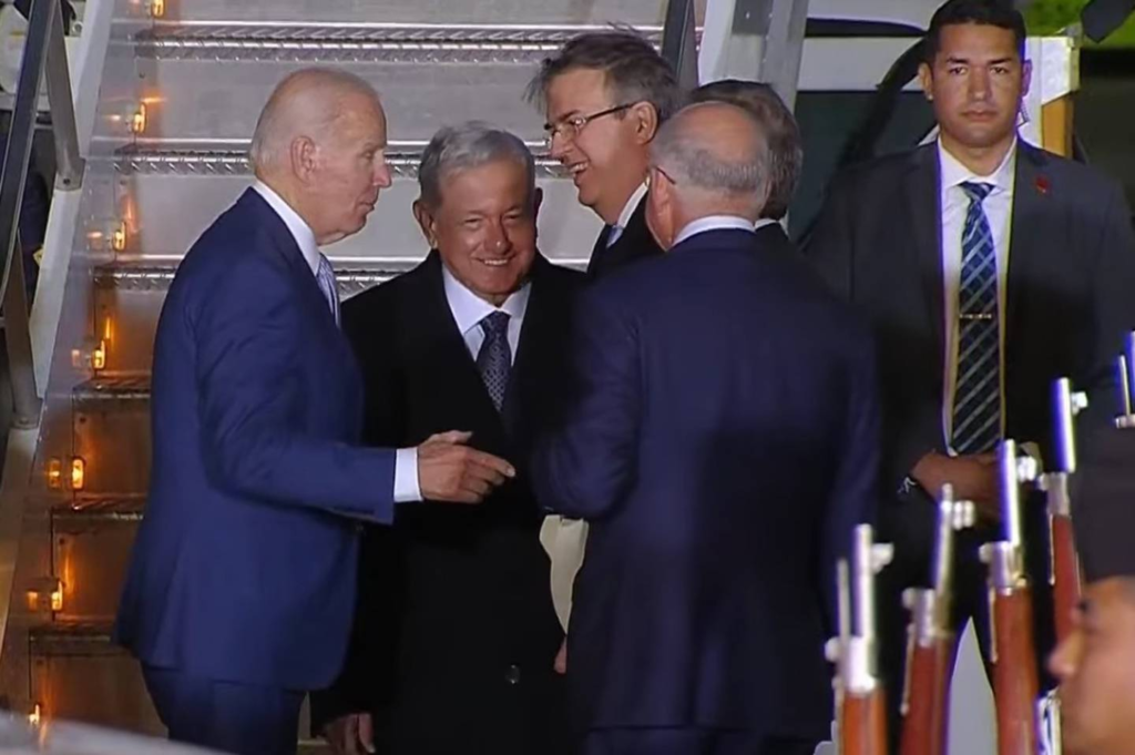 Luego de bajar de la escalera del avión presidencial, Joe Biden fue recibido por el presidente Andrés Manuel López Obrador, el secretario de Relaciones Exteriores (SRE), Marcelo Ebrard; el embajador de México en Estados Unidos, Esteban Moctezuma Barragán y el embajador de Estados Unidos en México, Ken Salazar.