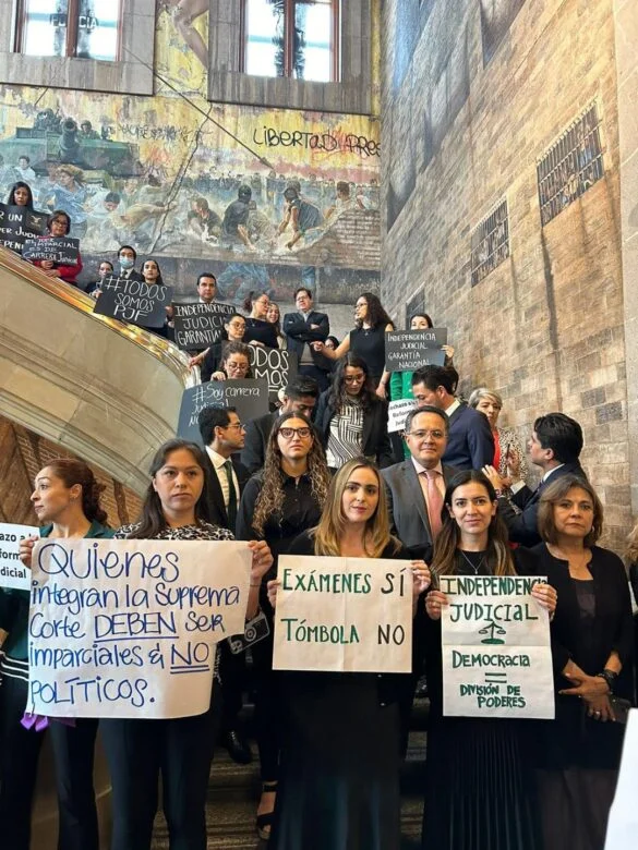 La entrada a la ponencia de “la ministra del pueblo” terminó por ser una suerte de tendedero de pancartas: “La falta de preparación también es corrupción”, “Sin colores sin partido, la justicia se ha impartido”, “La justicia no se vota”, “El ministro imparcial es de carrera judicial”, “Reforma judicial igual a retroceso nacional” y “La autonomía no es una tómbola” se leía en las cartulinas.