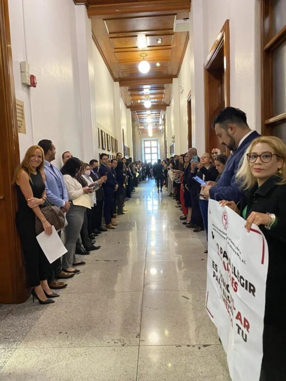 Así, los trabajadores formaron vallas a lo largo del pasillo que lleva hacia el salón de sesiones y por donde tenían que pasar los ministros, para lo cual se armaron con cartulinas en las que exigían solidaridad en la lucha contra la reforma judicial y hasta una bandera nacional.