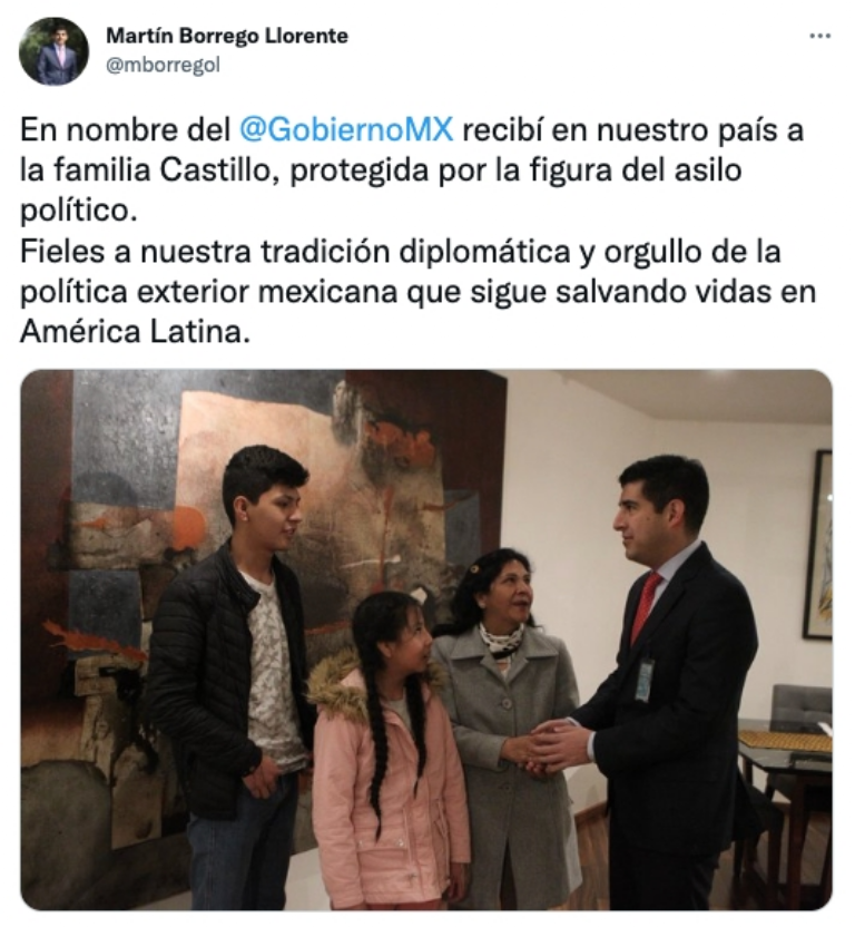 A través de su cuenta de Twitter, Martín Borrego informó que fue él quien recibió a la familia del ex presidente de Perú: “En nombre del @GobiernoMX recibí en nuestro país a la familia Castillo, protegida por la figura del asilo político. Fieles a nuestra tradición diplomática y orgullo de la política exterior mexicana que sigue salvando vidas en América Latina”.