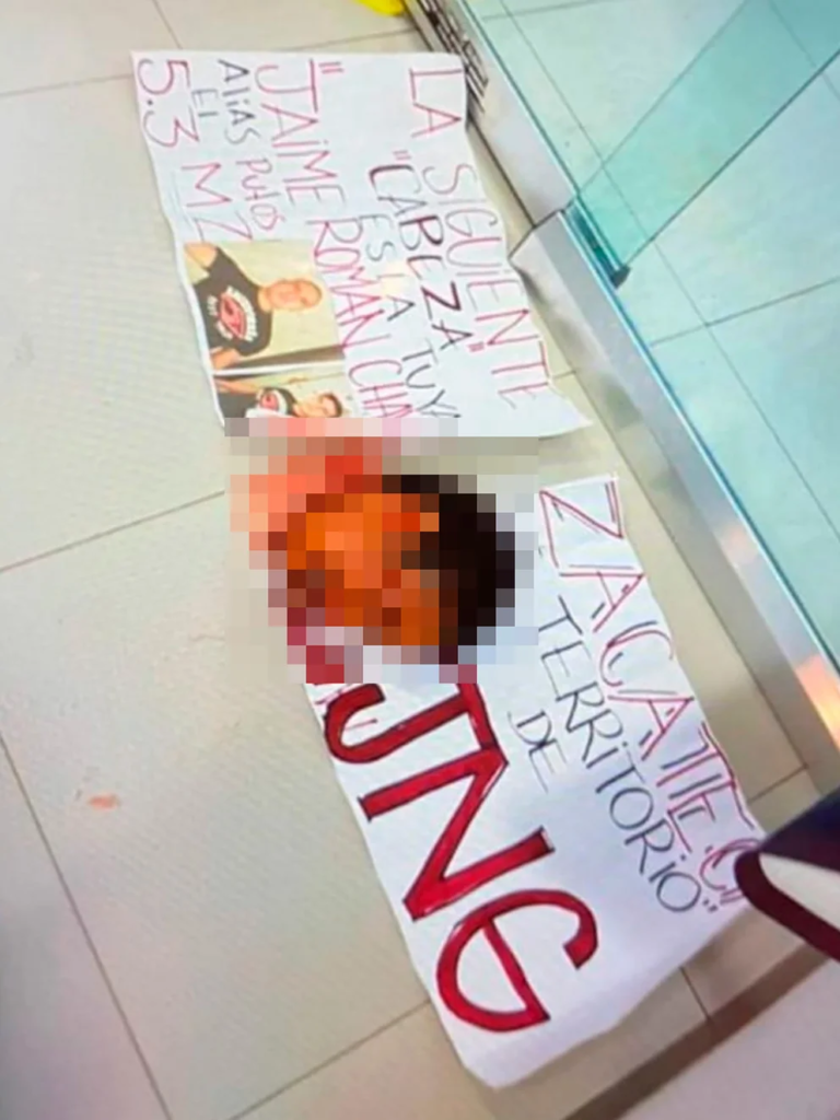 En el texto de las cartulinas blancas, se pudo leer una narcoamenaza a un supuesto integrante del Cártel de Sinaloa: “La siguiente cabeza es la tuya, Jaime Román Chávez, alias el 5.3. Pu..s MZ (Mayo Zambada), Zacatecas, territorio del CJNG”.