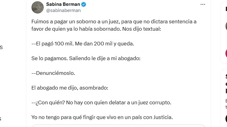 Como supuesta prueba de la necesidad de la Reforma Judicial, Berman relató en su cuenta de X que ella dio a un juez un soborno de 200 mil pesos para que fallara a su favor. Terminó su relato con el comentario de que no hay donde denunciar a los jueces que cometen corrupción, sin importarle su confesión de soborno, un delito.