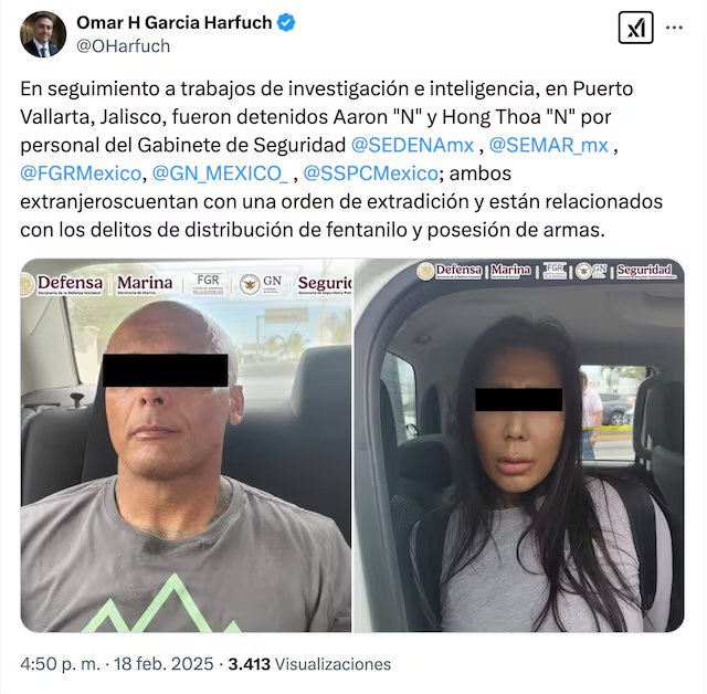 La detención de dos extranjeros en Puerto Vallarta, Jalisco, por narcotráfico, anunciada por Omar García Harfuch, jefe de la Secretaría de Seguridad Ciudadana de la Ciudad de México, es parte de los esfuerzos de coordinación bilateral entre México y Estados Unidos para combatir el tráfico de drogas y la violencia asociada. Los detenidos, identificados como Aaron N y Hong Thoa N, tienen órdenes de extradición por delitos relacionados con el tráfico de fentanilo y posesión de armas.