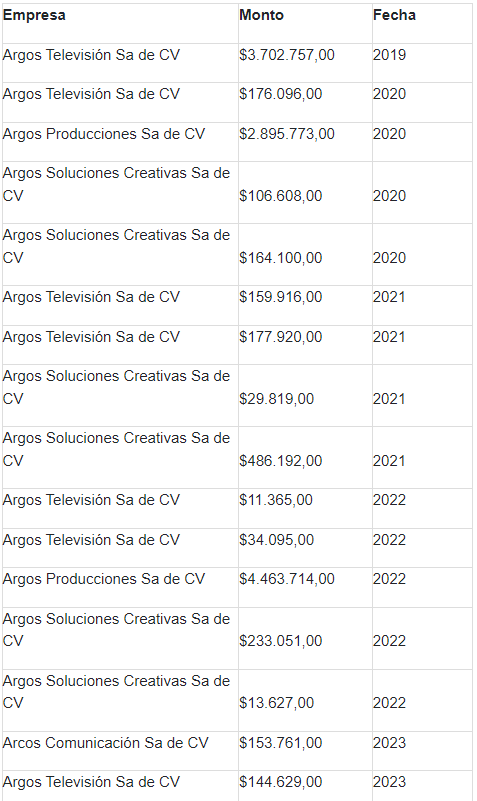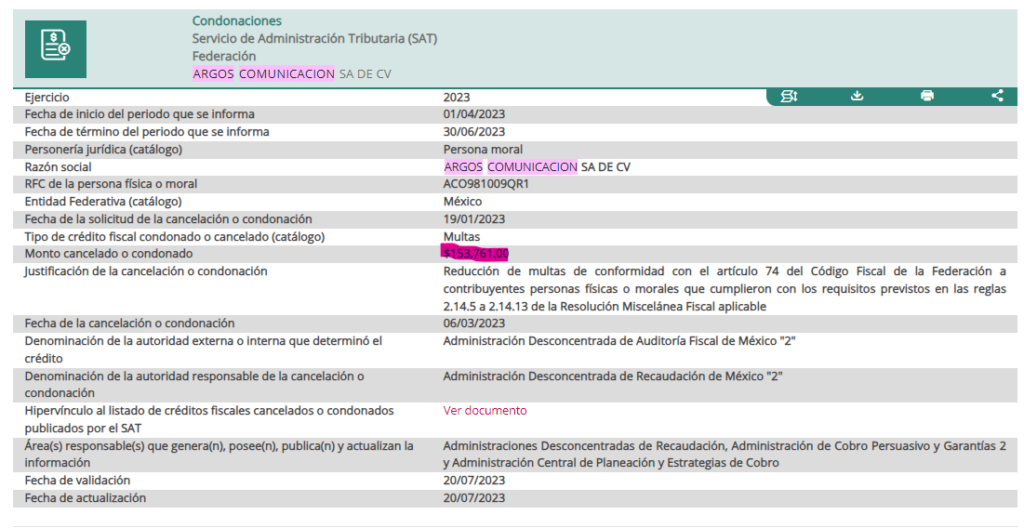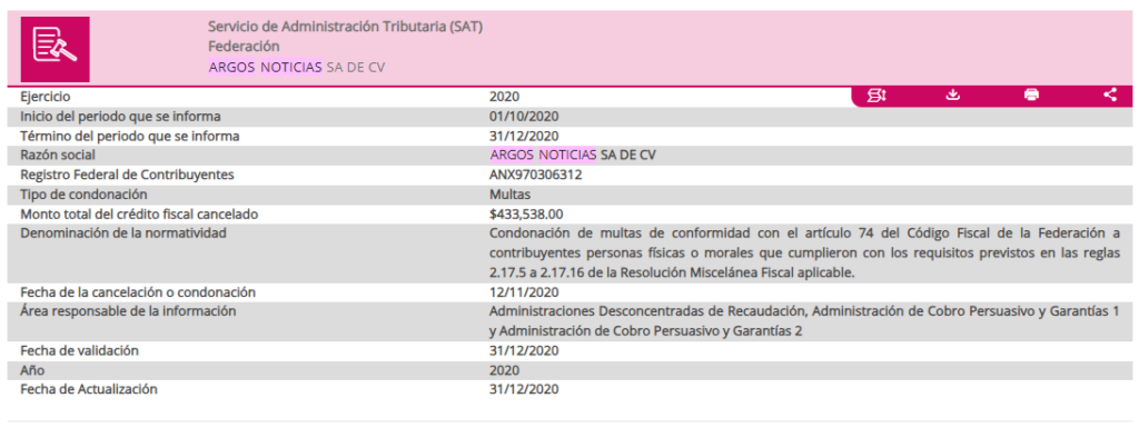En el 2023, Argos Comunicación SA DE CV, con el RFC ACO981009QR1, recibió una reducción de multas por parte del Servicio de Administración Tributaria (SAT), correspondiente al ejercicio 2023, por 153 mil 761 pesos, como se puede consultar en la Plataforma Nacional de Transparencia del Instituto Nacional de Acceso a la Información (INAI).