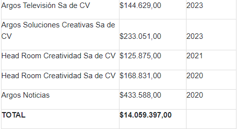 Además, a través de la empresa Argos Soluciones Creativas, RFC ASC9602164P2, recibió también durante los últimos años varias reducciones fiscales por multas por parte del Servicio de Administración Tributaria. Otras empresas del grupo que recibieron condonaciones fueron Head Room Creatividad SA de CV y Argos Noticias.