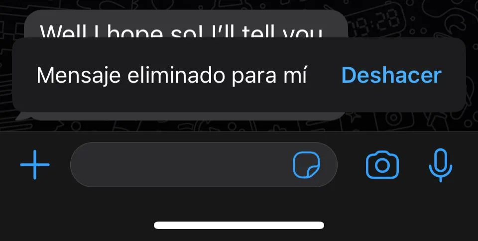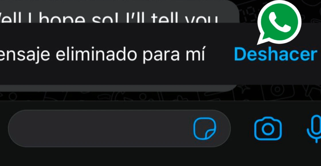 Eso lo pueden comprobar al borrar un mensaje con la opción “sólo para mí”. Inmediatamente la aplicación te recuerda que el mensaje eliminado fue sólo para tu chat y te da automáticamente la opción de “Deshacer”, con la cual el mensaje vuelve y ahora sí, te da chance de eliminarlo para todos.