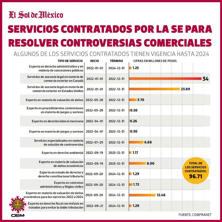 En 2022, la Secretaría de Economía (SE) destinó alrededor de 96.7 millones de pesos para la contratación de asesores externos en controversias internacionales, de acuerdo con información publicada en Compranet.