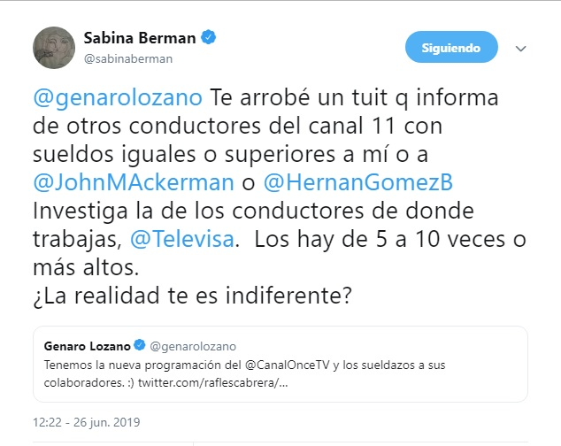 Acto seguido, pretende justificarse con el argumento de que en el mismo Canal Once hay quien gana más que ella, John Ackerman y Hernán Gomez, pero no dice quiénes y le deja la tarea de descubrirlo al conductor y activista Genaro Lozano, quien la cuestionó al respecto en Twitter. Y para rematar, le quiere voltear la tortilla con el pueril argumento de que en Televisa los sueldos son 5 o 10 veces mayores.