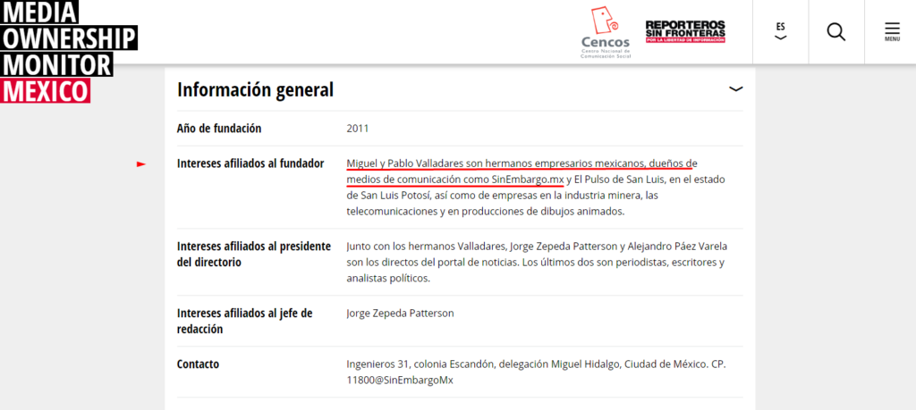 Miguel Valladares García y Pablo Valladares García, son fundadores y socios mayoritarios en el Consejo de Administración del periódico Sin Embargo MX, de acuerdo con la información de Reporteros Sin Fronteras y el Centro Nacional de Comunicación Social (Cencos A.C.)