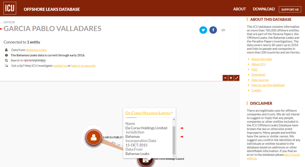 BASE DE DATOS: Panamá Papers, del Consorcio Internacional de Periodistas de Investigación (ICIJ). Pablo Valladares García. Link. https://offshoreleaks.icij.org/nodes/22012522