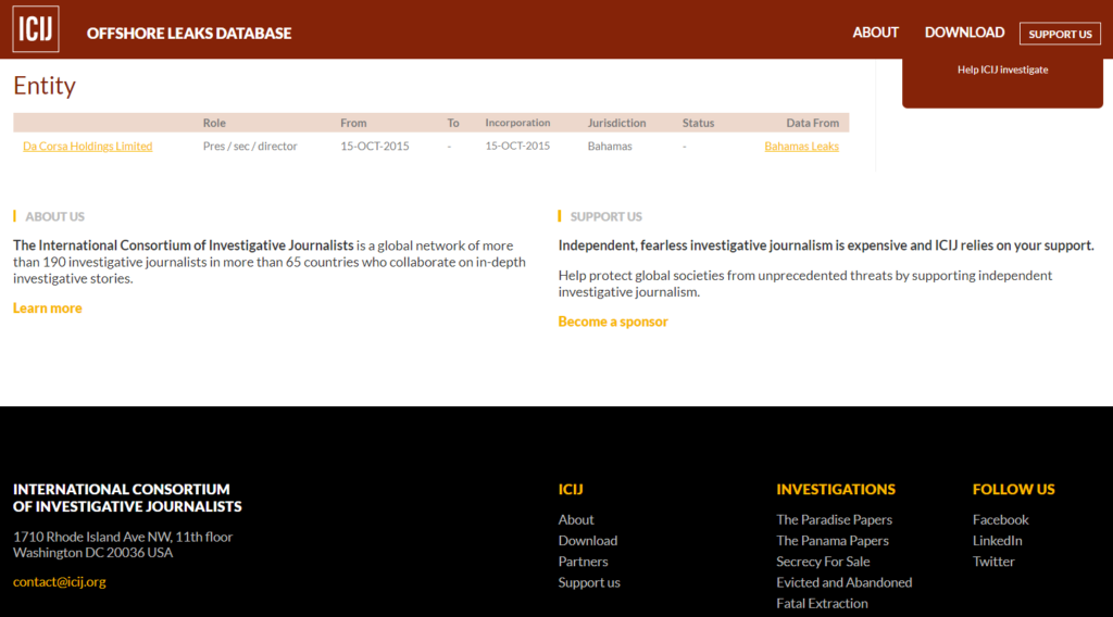 Pablo aparece vinculado a la compañía offshore Da Corsa Holdings Limited, teniendo como paraíso fiscal las Bahamas, de acuerdo a la base de datos: Panamá Papers, del ICIJ.