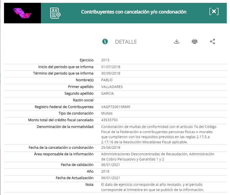 El Servicio de Administración Tributaria (SAT) condono $ 829,120.00 de multas fiscales del ejercicio 2019, a Pablo Valladares García, propietario del periódico digital Sin Embargo MX, durante el mandato del presidente López Obrador. Fecha de validación 06/01/2021.