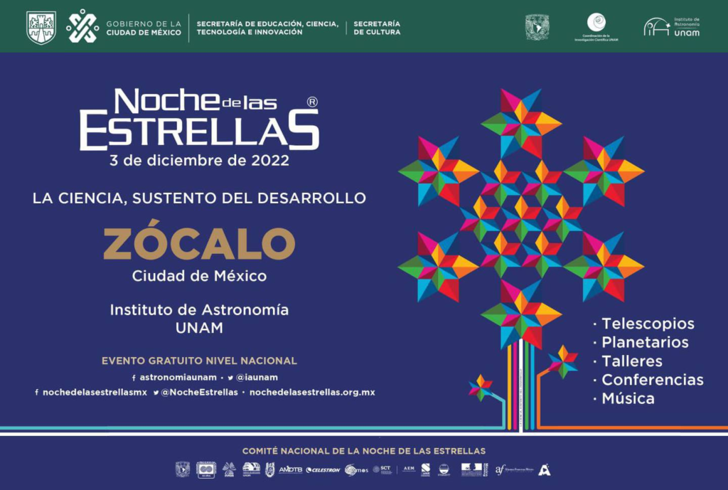 La edición de Noches de Estrellas 2022 se realizará en la plancha del Zócalo capitalino, donde habrá varios espacios en los que se impartirán talleres y conferencias de temas astronómicos, de cuerpos celestes y la vía láctea. Este evento es organizado por la UNAM a través del Instituto de Astronomía, quien colocara más de 500 telescopios para niños y adultos puedan disfrutar del cielo nocturno.