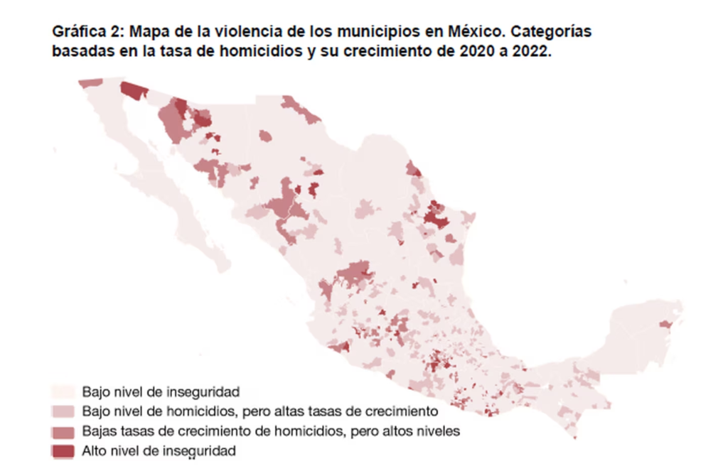 Para clasificar los municipios se evaluó tanto la tasa de homicidios per cápita del año más reciente como la tasa de variación durante el mismo período. Las categorías fueron determinadas según la tasa de homicidio por cada 100 mil habitantes en 2022 y la tasa de crecimiento de homicidios de octubre de 2020 a septiembre de 2021 y de octubre de 2021 a septiembre de 2022.