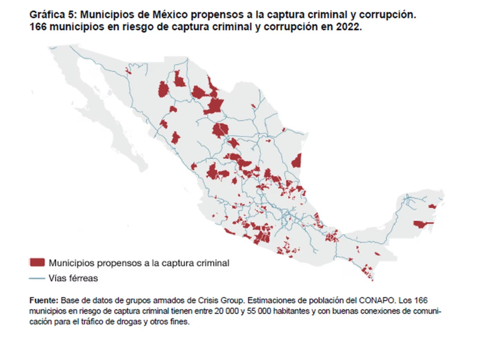 “Un funcionario de alto rango de la Secretaría de la Defensa señaló que la corrupción entre alcaldes y policías locales es mucho más frecuente en áreas marcadas por la presencia de grupos criminales. Estas áreas son principalmente municipios con poblaciones entre 20 mil y 55 mil habitantes, y ubicados cerca de vías férreas, ofreciendo fácil acceso a los puertos y a Estados Unidos, lo que los hace propicios para el tráfico de drogas y otras actividades ilícitas. En 2020, de los 531 municipios con presencia de grupos criminales, 166 cumplían estos criterios, lo que representa el 7% del total de municipios de México.
